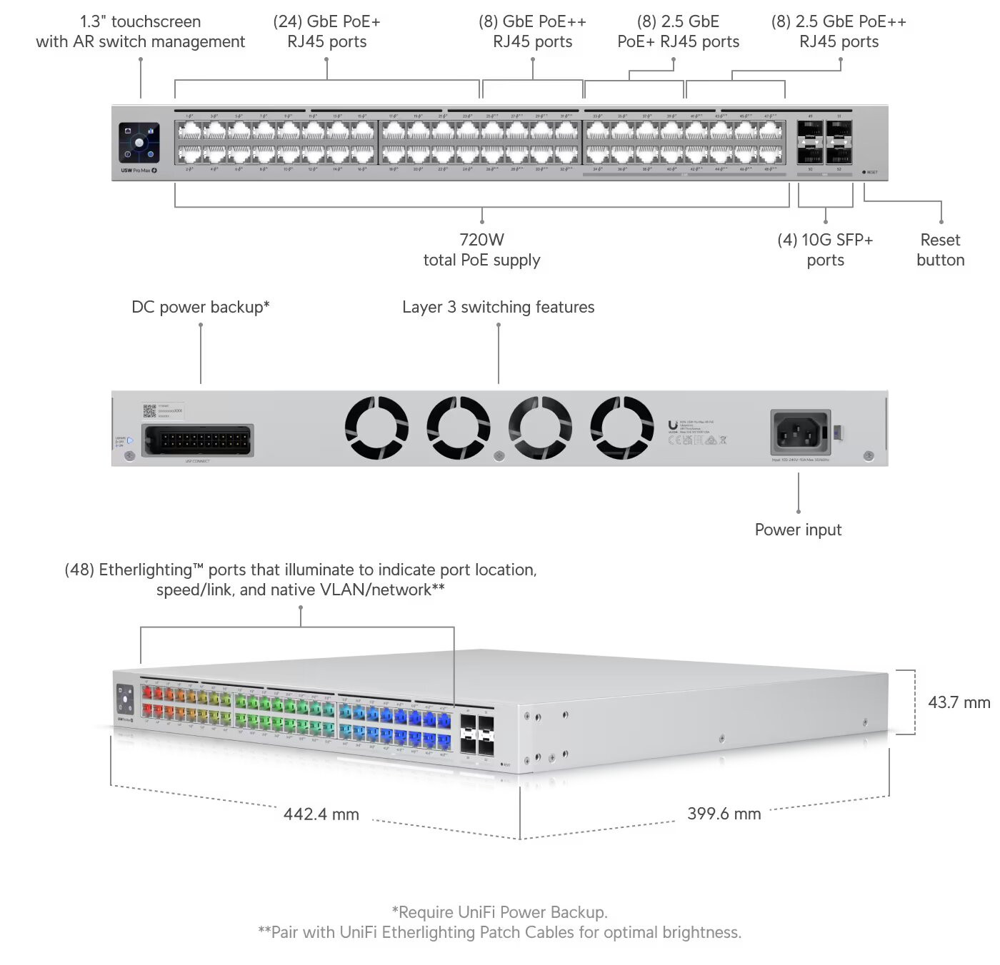 L'une des caractéristiques remarquables de l'USW-Pro-Max-48-POE réside dans ses ports Etherlighting™, qui s'illuminent pour faciliter l'identification de l'emplacement des ports, des vitesses/liaisons et des paramètres VLAN/réseau natifs, en particulier lorsqu'ils sont associés aux câbles de brassage UniFi Etherlighting. Cette aide visuelle est conçue pour simplifier la gestion du réseau et le dépannage.