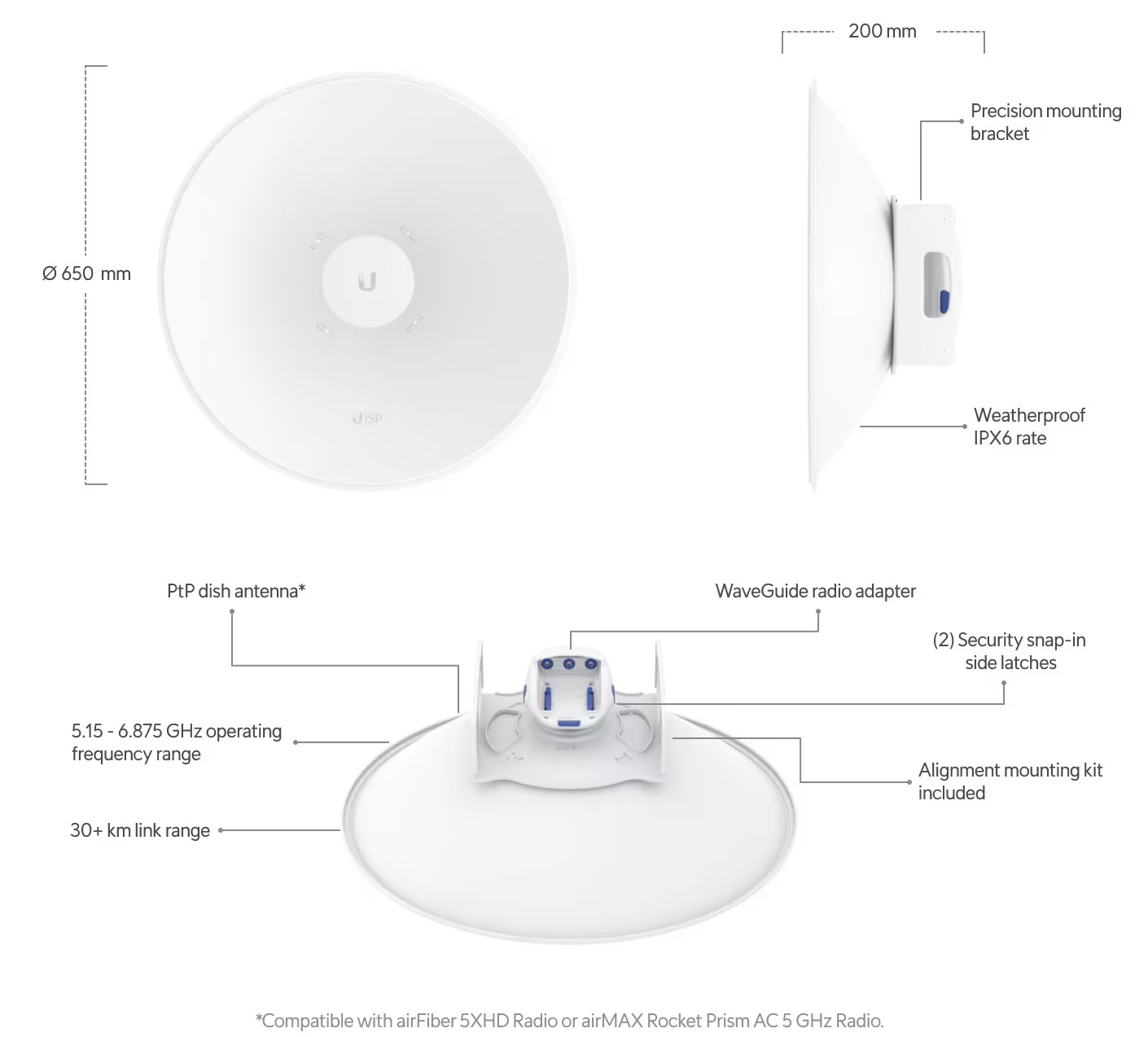 Compatibilité avec les radios airMAX Rocket Prism 5AC (RP-5AC-Gen2) et AirFiber 5XHD (AF-5XHD).